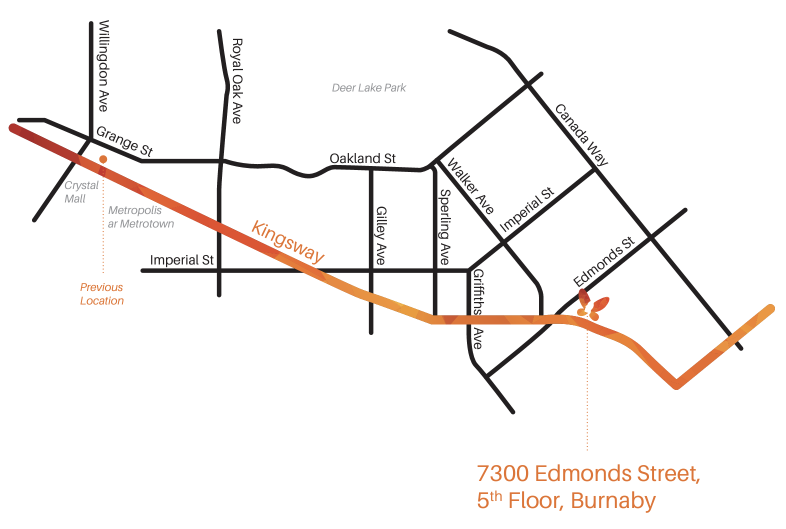or #119 Bus via Metrotown Stn, get off at Kingsway @ Walker Ave, Walk 2 mins towards Edmonds Street to 7300 Edmonds Street We are located on the 5th floor.